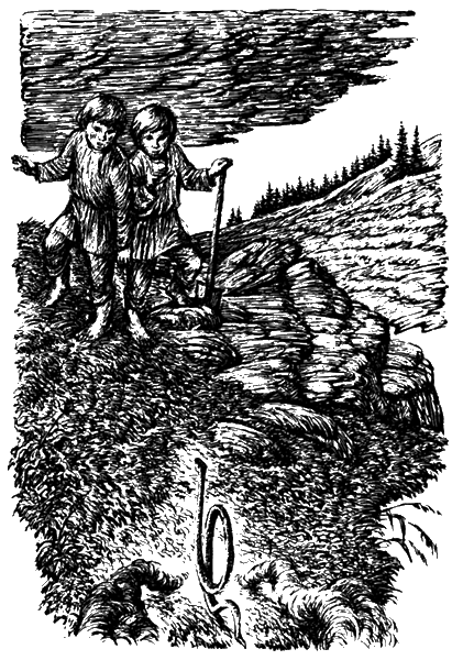 Так и сделали: повернулись спинами к женщине, сидят и глаза зажмурили. Вдруг их подняло. Открыли глаза, видят — сидят на том же месте, только примятая трава поднялась, а кругом два широких обруча, один золотой, другой чернокаменный. Видно женщина обошла их кругом, да из рукавов и насыпала. Ребята кинулись бежать, да золотой обруч не пускает; как перешагивать — он и поднимется и поднырнуть тоже не дает.