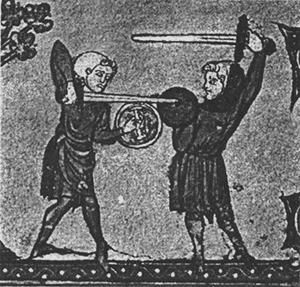 Нет, не подумайте, что мечевой бой возможен только при тяжелом защитном вооружении. И в легком возможен, и вообще без оного. Но он, при любом варианте, очень, ОЧЕНЬ отличен от шпажного фехтования. В особенности — от считающегося классическим (а на деле — одного из, причем позднего) стиля, где все атаки и защиты производятся правой рукой, причем оружие действует исключительно «благородной частью», острием и лезвиями клинка. Этот стиль и в шпажном-то фехтовании на поле боя, именно на нем, применялся ограниченно. Но о шпажном фехтовании — в другой раз.