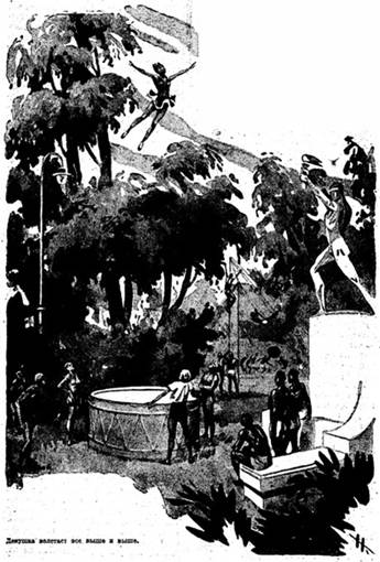 А дальше перелетают — вернее перепрыгивают — через площадь люди с привязанными небольшими воздушными шарами, которые уравновешивают вес их тела. Человек «ничего не весит» и при малейшем прыжке отделяется от земли. Помнится, такой спорт был изобретен в Америке. Но какая ловкость и точность у этих летучих людей! А вот нечто совершенно невиданное. У спортсменов на подошвах прикреплены вероятно пружины, потому что эти спортсмены прыгают так, как впору прыгать только блохе. Этот спорт требует большой ловкости и грозит большим риском, чем прыжки на барабане. Но прыгуны очевидно хорошо тренированы и ловко перепрыгивают через киоски и даже через небольшие деревья.