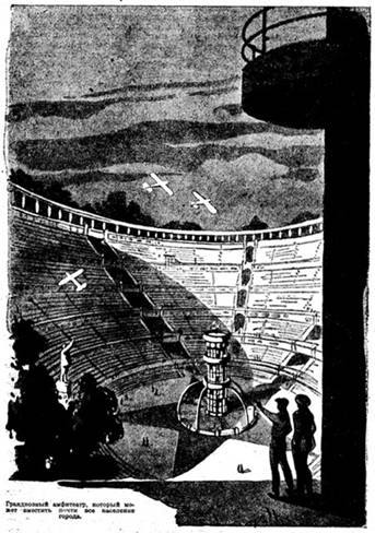Что вам сказать о ней? Сравнить ли ее с огромным кратером вулкана, или же с римским амфитеатром? Глядя на эту площадь, я еще раз убедился, какое огромное преимущество заключается в том, чтобы стоить город не десятками и сотнями лет, а строить сразу, по определенному плану. Только при таком условии можно было сразу сделать эту оригинальнейшую в мире площадь. Она имеет совершенно круглую форму. Со всех сторон ее окружают здания, которые построены так, что уступами спускаются к площади этаж за этажом. На каждом уступе имеются возвышающиеся друг над другом ряды скамей. на самой площади. взбегая до высоты первого этажа, расположен настоящий амфитеатр, составляющий единое целое с амфитеатром, расположившимся по уступам-этажам окружающих домов. Благодаря такому устройству получается один грандиозный амфитеатр, который может вместить