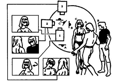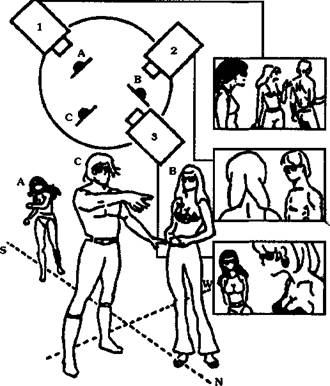 В этой группе лидирующий актер размещен в центре. (Актриса В на рис. 6.31). Когда она говорит с С (например восток-запад), устанавливается связь между планами 1 и планом 2. План 2 повернут к плану 1 на 90°.