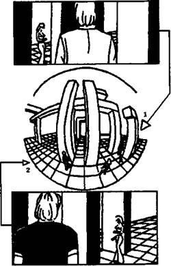 В следующем примере две противостоящие съемочные точки смещаются на приближенные планы по отношению к главному персонажу в соответствии с треугольной схемой размещения актеров. Передвижения одного актера можно представить следующим образом
