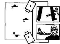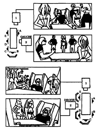На рис 7.2, 7.3 и 7.4 камера расположена очень близко к группе, исключая таким образом некоторых актеров из плана. На рис. 7.5 расстояние от камеры одно и то же в обоих положениях. Это расположение под прямым углом создает на экране ситуацию, схожую с основными формулами для быстрой съемки трех персонажей. С использованием второй камеры слева, первый актер оказывается справа, остальные располагаются следующим образом: