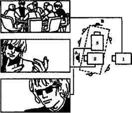 Съемка группы из пяти человек внешними контрпланами основана на тех же правилах. Рис. 7.6 показывает нам два возможных варианта для одного и того же случая. В первом из них линия интереса проходит между актерами С и Е, а во втором - между С и А. Два актера, расположенные с противоположное стороны от линии интереса, переходят из одной части кадра в другую. Когда доминируют актеры С и Е, эпизод представлен следующим образом:
