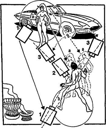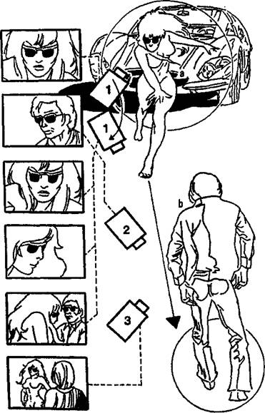 Два плана-эпизода могут монтироваться параллельно. Этот прием прост. Последняя часть первого основного общего плана согласуется с первой частью второго плана. Следующий пример показывает такую возможность. На рис. 27.3 можно увидеть план съемочной площадки, где показаны движения всех актеров, занятых в сцене.