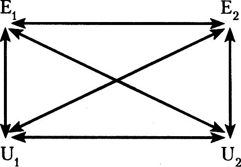 Согласно данной диаграмме, существует двенадцать возможных направлений распространения энергии, и только два из них являются осознанными, а еще два могут стать таковыми. Энергия может распространяться в любом направлении от Е1 к Е2 (от одного Эго к другому). Кроме того, она может распространяться от Е1 к U1 и от Е2 к U2. Далее, в случае включения U (динамической психологической истории) каждого из партнеров — а это в большей или меньшей степени происходит всегда — ее содержание будет проецироваться на Е (Эго) Другого соответственно приведенным на схеме двум диагоналям26.