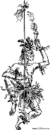 И вот на пороге встал бомо с пылающим факелом в левой руке. Отблески огня играли на страшном лице, раскрашенном белыми и красными полосами и треугольными знаками. В правой руке покачивалась бамбуковая палка, похожая на пику. Да и сам бомо качался, как пьяный, подергивая, точно от холода, плечами. Обе руки от плеча и до кисти были обвязаны цветными лентами, концы их мотались на ветерке, извивались, как змеи. Бомо посмотрел в одну сторону, в другую, вытягивая шею, как черепаха, и вдруг прыгнул туда, прыгнул сюда, уколов воздух пикою. А сам чем-то пронзительно пищал, видимо, положил листок за зубы, хотел, чтоб люди думали, будто это пищат и убегают злые духи. Он то шел по кругу подогнув ноги, то прыгал обеими сразу, как воробей, и в такт колол пикою в стороны, вычерчивая огнем какие-то знаки. В глазах бомо сверкали огненные отблески, казалось, что из них, как из факела, сыплются искры.