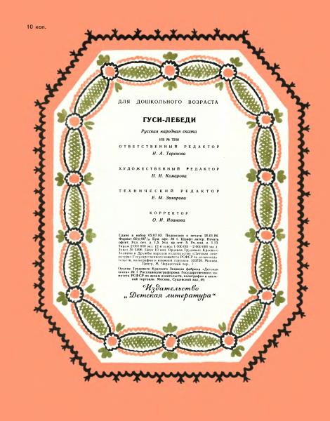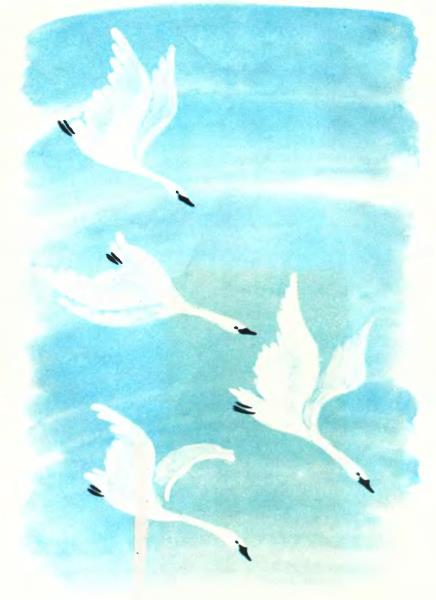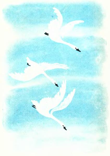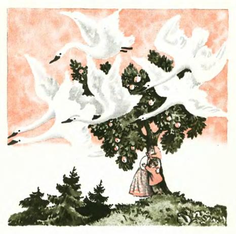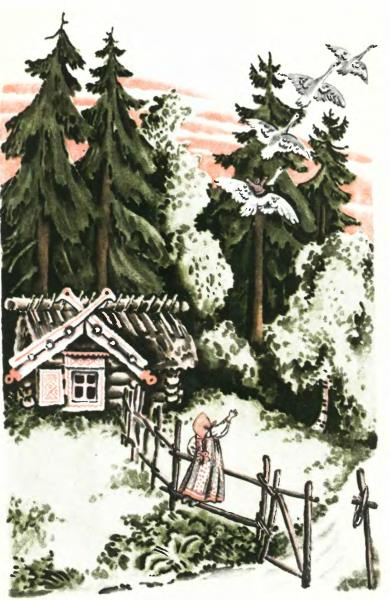 Выбежала она в чистое поле и только видела: метнулись вдалеке гуси-лебеди и пропали за тёмным лесом. Тут она догадалась, что они унесли её братца. Про гусей-лебедей давно шла дурная слава — что они пошаливали: маленьких детей уносили.