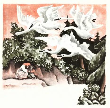 Налетели гуси-лебеди, подхватили мальчика, унесли на крыльях.