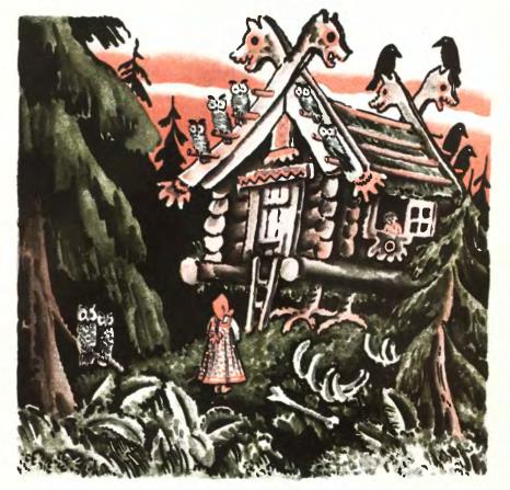 Долго она бегала по полям, по лесам. День клонится к вечеру, делать нечего — надо идти домой. Вдруг видит — стоит избушка на курьих ножках, об одном окошке, кругом себя поворачивается.
