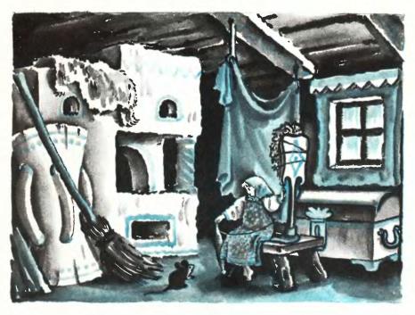В избушке старая баба-яга прядёт кудель. А на лавочке сидит братец, играет серебряными яблочками.