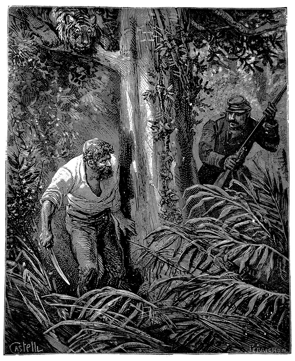 Но перед ним стоял грозный противник. Каторжник отбросил рогатину и занес мачете в правой руке. Клинок, направленный железной рукой, обрушился на шею зверя, мощную и мускулистую, как у бычка.