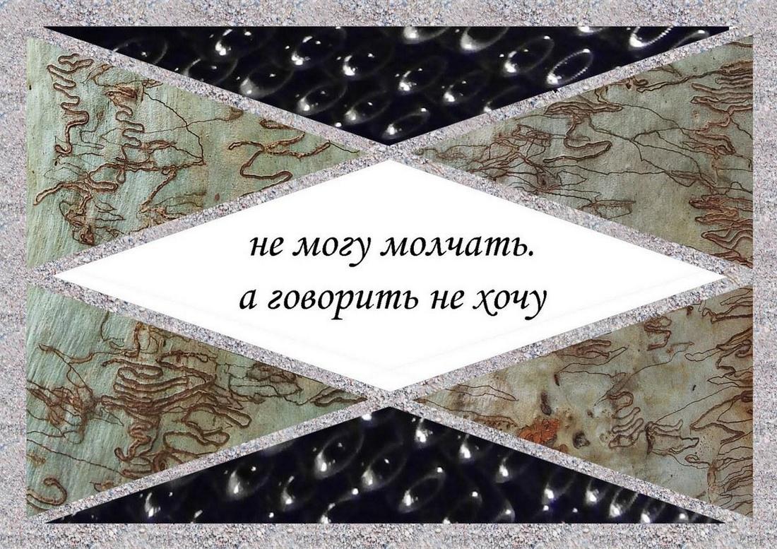 В одном из наших с Борисом проектов эти визуальные стихотворения были показаны без текста, как знаки отсутствующего письма, звуки утраченного стихотворения. В этом случае белизна в центре изображения заполняла слово, смысл пропадал, растворяясь в листьях, песчинках, узорах на коре – знаках природного письма. Однако и в таком виде слово существовало – и даже могло быть восстановимо, ведь изображения не стирали слово, но скрывали под непрозрачным белым слоем поверх слоя письма. Даже невидимое – оно существовало, даже неразличимое – было, и читатель мог соотнести своё представление с текстом.