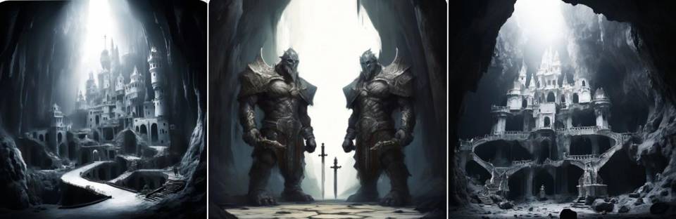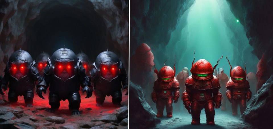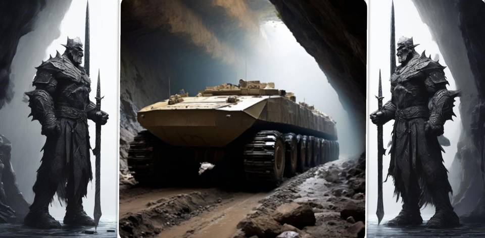 Потолок тоннеля резко ушел вверх и перед нами открылась огромная пещера в которой находились два замка окруженные другими строениями и аккурат посередине между ними кипела битва. Два отряда коренастых воинов, одни в черных доспехах, а другие в красных, рубили друг друга холодняком. Причем победителями пока не выглядел ни одна из сторон. И тут приборы на панели управления словно взбесились и сзади нас появилась туманная стена, которая, через мгновение предстала каменным монолитом.
