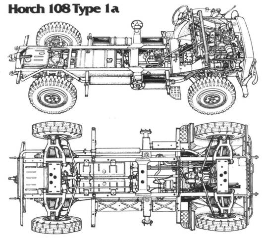 Внимательное изучение приведенной таблицы выпуска армейских машин Horch позволяет задуматься над таким интересным фактом: если авторитетный танковый специалист австриец Хейгель в своем справочнике описал тяжелое шасси Horch, представлявшееся на выставке 1935 года, а первый Horch 108 был сделан в 1938 году, то что же было представлено в качестве выставочного экспоната? И почему Хейгель сразу завел речь о шасси бронеавтомобиля с задним расположением двигателя?