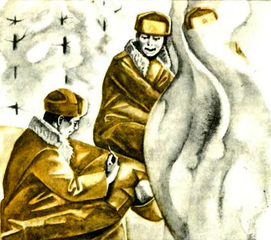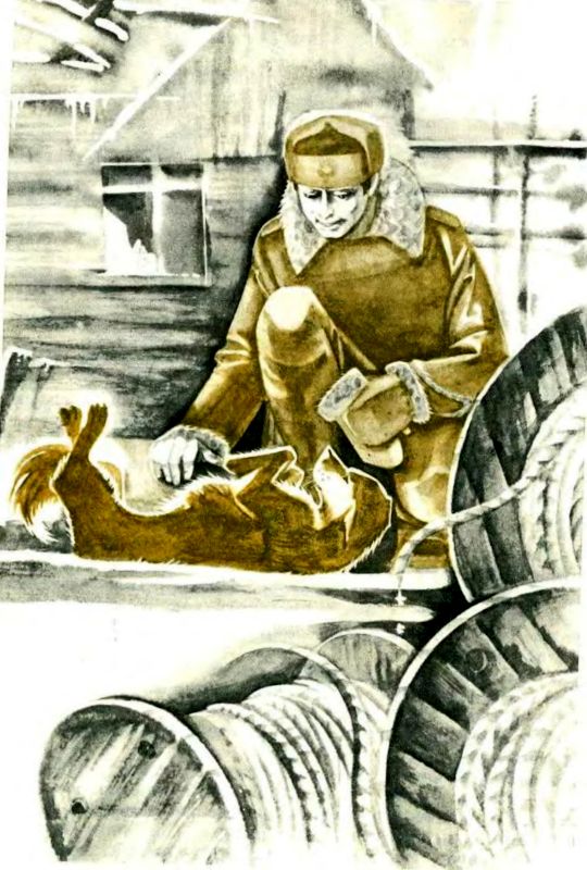 Сибиряков стал на лыжи, надел белый халат, взял винтовку, свистнул. Накормленная собака побежала за ним, как за хозяином.