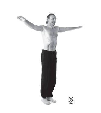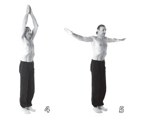 3. Продолжайте медленный и глубокий вдох, одновременно плавно поднимая руки (ладони обращены вниз) через стороны – это позволит вдыхаемому воздуху заполнить верхний отдел легких.