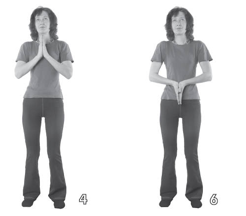 9. Опускайте руки, пока сложенные ладони не коснутся низа живота. Выдох должен быть завершен одновременно с этим касанием.