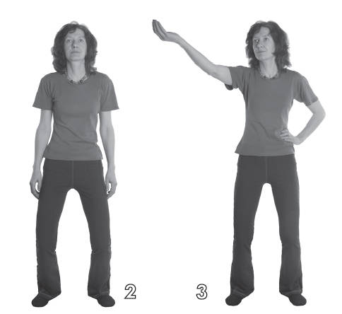 2. Начиная делать медленный спокойный вдох, оторвите правую руку от пояса, разожмите кулак и поднимайте согнутый локоть вверх движением руки в плечевом суставе. Раскрытая ладонь при этом обращена назад. Стремитесь, чтобы локоть поднялся до уровня уха. Затем в продолжение начатого вдоха вдохните сильно, энергично и шумно, и одновременно сделайте рывок рукой, чтобы поднять локоть еще выше. Боковым зрением постарайтесь увидеть движение руки.