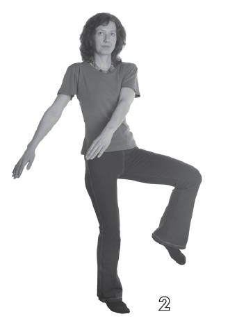 2. На вдохе делайте обеими руками перед собой машущие движения влево и назад, будто отгоняете воду. Одновременно поясницу разворачивайте чуть вправо, сгибайте в колене правую ногу и поднимайте ее от пола, чтобы тут же энергично опустить обратно – будто вы топаете ногой по воде. Следите глазами за движением колена.