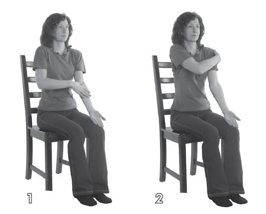 1. Сядьте на стул, спину держите прямо. Ладонью правой руки сделайте растирающее движение с нажимом по внутренней стороне левой руки от запястья до подмышечной впадины.