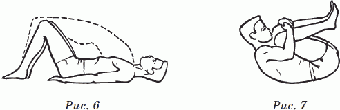 Вытяните руки в стороны, ноги согните и, упираясь стопами в постель, приподнимите таз вверх. Опустите – поднимите. Из этого положения отведите таз вправо, затем влево. Теперь поднимите таз и сделайте круговое движение тазом вправо, затем влево (рис. 6).