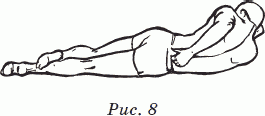 10. С утра должен начать работу желудочно-кишечный тракт, и надо подготовить его к работе заранее. Для этого опустите ноги, вытянитесь и повернитесь направо (рис. 8). Левой рукой старательно и мягко разотрите поясницу несколько раз всей ладонью. В области поясницы находятся нервы, управляющие работой желудочно-кишечного тракта. Повернитесь налево и повторите растирание другой рукой.
