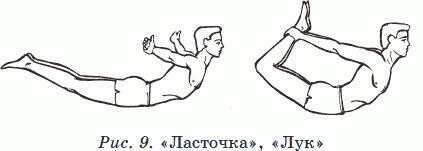 11. Теперь можно еще сильнее активизировать свой организм. Для этого надо перевернуться на живот и сделать «Ласточку» (одновременно прогнуться, приподнять грудь, ноги и руки). Зафиксировав конечное положение в течение 1–3 секунд, расслабиться. Сделайте потягивание всем телом. Теперь попытайтесь достать руками стопы, то есть принять асану «Лук», и покачаться в таком положении на животе (рис. 9).