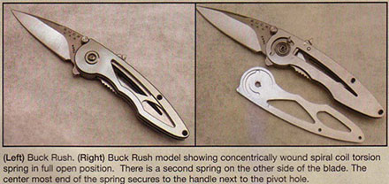 Компания Buck пользуется своей собственной конструкцией механизма вспомогательного открывания. Эта конструкция состоит из двух концентрических витых торсионных пружин, расположенных на поворотной оси лезвия, по одной на каждой стороне. Данный тип пружин обеспечивает постоянное, прогрессивно увеличивающееся давление из полностью раскрытого до полностью закрытого положения. Проблемой является безопасная фиксация лезвия в закрытом положении и быстрая готовность к открыванию.