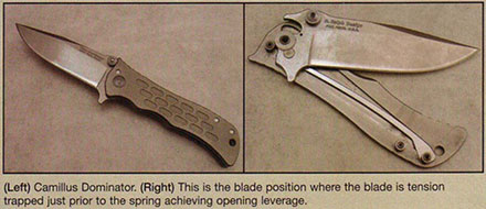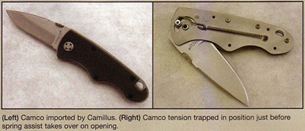 Новый механизм раскрывания ножей Camco, импортируемых Camillus, использует спиральную витую пружину, установленную на лайнере (внутренней прокладке), которая выталкивает лезвие с помощью соединительной штанги, крепящейся к лезвию через С-образную прорезь в лайнере. От закрытого состояния до угла раскрытия (примерно 45°) пружина помогает закрыть или удержать лезвие в неподвижном состоянии. От 45° до полного открытия пружина работает на выталкивание лезвия.