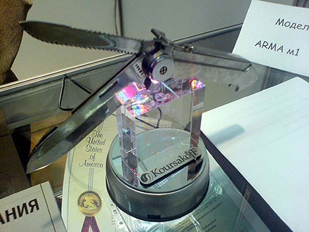 Особенно хочется отметить нож Курсакова, впервые представленный на «Клинке» и завоевавший огромный интерес публики. К воскресенью все изделия раскупили, а цена не маленькая: в зависимости от корпуса от трёхсот до пятисот долларов. По словам мастера, это тактический нож выживания, имеющий в своей конструкции четыре изобретения, в данный момент проходящие процедуру патентования за рубежом. Выглядит громоздким, но сразу привлекает внимание оригинальное решение — вставное лезвие легко убирается в основное. Весит прилично — 340 грамм, но я в руках держу экспериментальный образец, а промышленный вариант будет легче. Здорово сделан замок — в нём используется принцип затвора ружья. Хотелось бы посмотреть нож в действии.