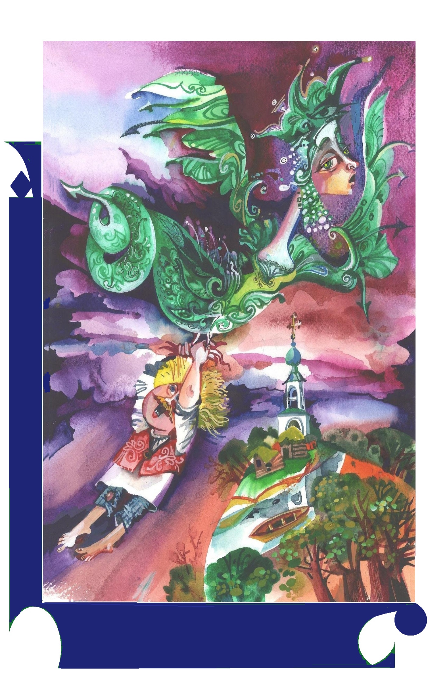 Но оказалось, что чудище только начало силищу свою окаянную показывать. Ещё выше, точно орёл под небеса, воспарило и за собой Афоню подняло высоко над землей. Глянул Афоня вниз и увидел, что его лодочка сиротливо плывет по течению без хозяина.