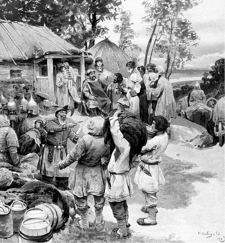 Полюдье. Князь Игорь собирает дань с древлян в 945 г. Художник К.В. Лебедев. 1901–1908 гг.