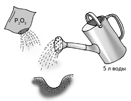 Внести в лунку столовую ложку двойного суперфосфата и 5 л воды.