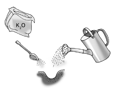 Внести столовую ложку любого калийного удобрения, не содержащего хлор, и не менее 2–3 л воды.