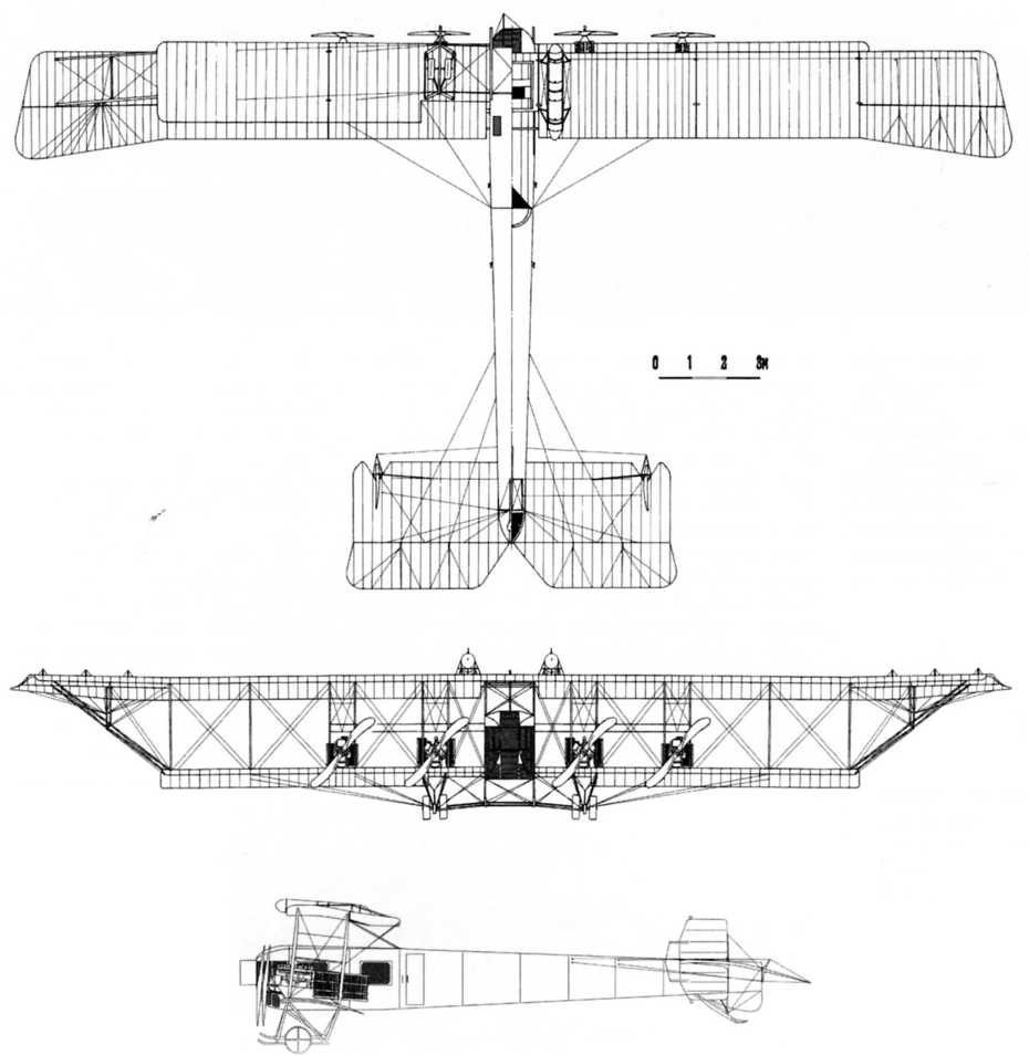 Если бы действительность показала, что большой аппарат вообще легко можно было бы рассчитать и построить и что бы он, в то же время, летал, то тогда, конечно, было бы гораздо целесообразнее прекратить постройку „Муромцев“, и приступить к постройке этого нового типа. Но, на практике выходит, что это не так легко, для этого нужно и время, и терпение, и деньги, а мы, ведь, сейчас в состоянии войны, лёгкая авиация не в таком блестящем состоянии, чтобы лишать нашу армию той, хотя бы, но мнению некоторых, и небольшой пользы, которую могут принести наши корабли в предстоящих операциях, подтверждением чего служит их двухлетняя полезная боевая работа. Поэтому желательно, пока что, остановиться на корабле типа Г с 4-мя моторами по 150–160HP и одновременно приступить к конструированию другого типа, и, на мой взгляд, было бы рациональнее выработать тип с 2-мя моторами, так как следующие два мотора уже приносят только отрицательные результаты с аэродинамической стороны и обслуживания корабля.