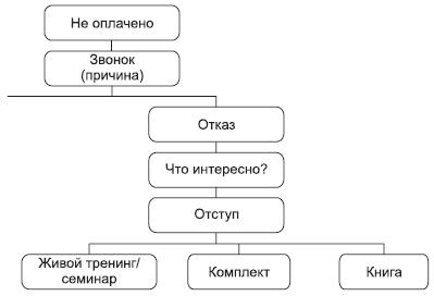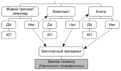 Если посмотрите на схему выше, то увидите, в какой последовательности расположены варианты отступов. На первом месте стоит живой тренинг, затем – комплект и, наконец, книга. Именно в таком порядке нужно предлагать продукты. Секрет в том, что продавать живые мероприятия в инфобизнесе проще, чем те, которые в записи. Поэтому если клиент отказывается от основного предложения, предложите ему участие в вашем живом тренинге или семинаре. Если отказываются и от этого, предложите еще более дешевый комплект. Если отказ и по комплекту – книгу. Ее, скорее всего, купят, потому что неловко отказываться от предложения, которое делают такое количество раз.