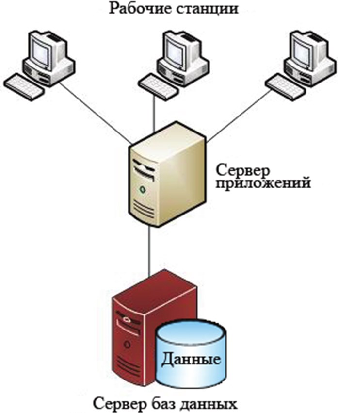 Легкая ERP-система способна использовать только один сервер баз данных и только один сервер приложений. Технологическая архитектура такой системы представлена на рис. 1.5. Все запросы пользователей, поступающие с рабочих станций, обрабатываются сервером приложений, который взаимодействует с сервером баз данных.