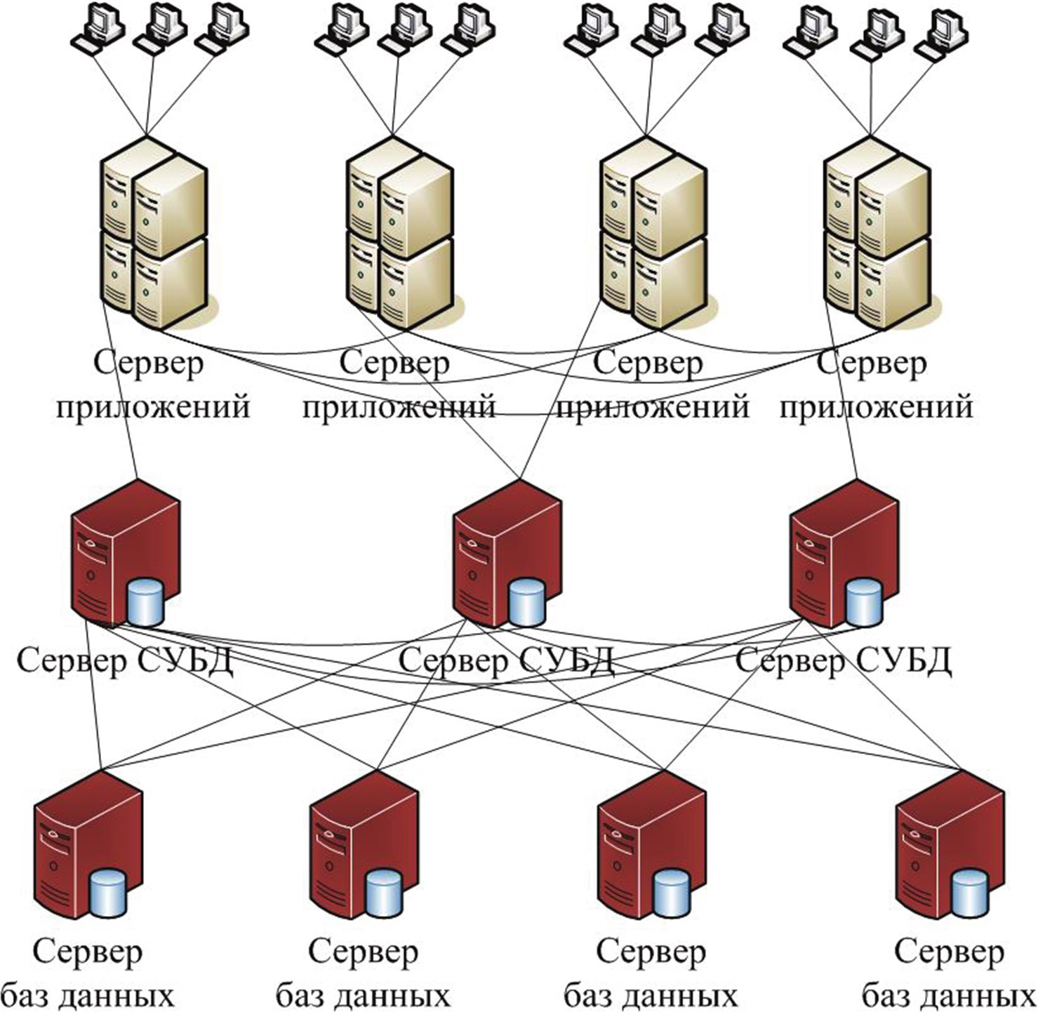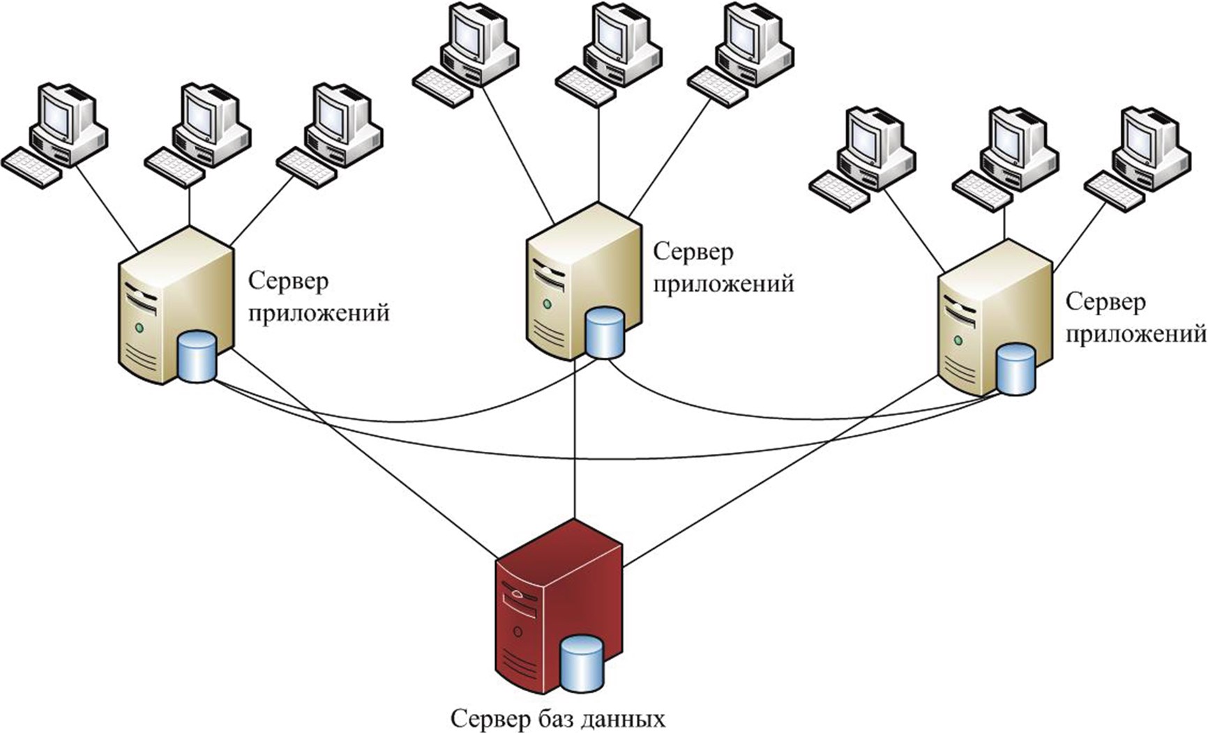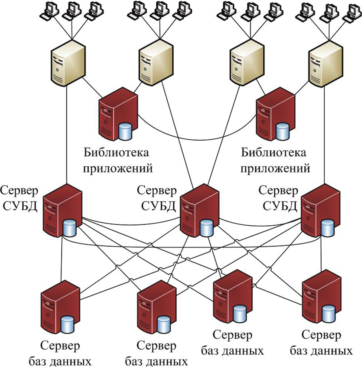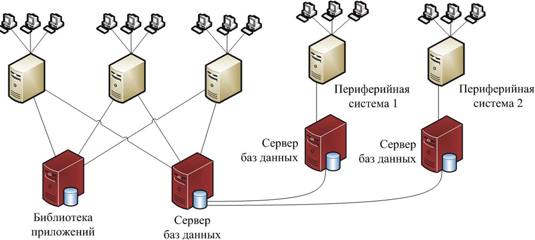 Рис. 1.11. Архитектура тяжелой ERP– системы, в которой каждый сервер приложений работает с собственной библиотекой