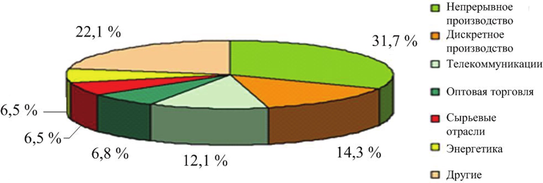 Предложенная классификация ERP– систем и проведенный на ее основе анализ условий применения систем различных классов показывают, насколько существенно технологическая архитектура создаваемой системы управления влияет на выбор ERP– системы, которая станет основой системы управления предприятием. Основной спрос на эти системы формируют крупные промышленные предприятия. Более 40 % всех внедрений на российском рынке ERP– систем приходится сегодня на промышленность [22]. Объемы внедрений ERP– систем по отраслям представлены на рис. 1.12.