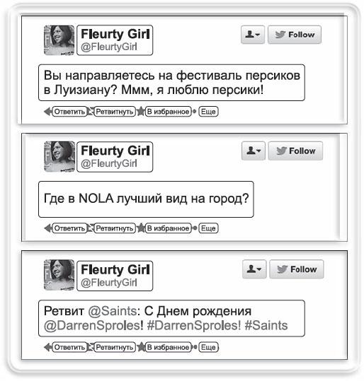 Многие люди, читающие эту книгу, являются владельцами малого бизнеса с одной торговой точкой. У Fleurty Girl пять магазинов, но это все еще малый бизнес. Владелицу компании отличает заинтересованность, которую она проявляет к своим покупателям – как онлайн, так и в своих магазинах. Лорен Том родилась и выросла в Новом Орлеане. Она любит разбрасываться акронимами вроде NOLA; она знает о фестивале персиков в Растоне; она сделала ретвит игроку New Orleans Saints – Лорен Том говорит на коренном языке платформы. Она еще не успела накопить большую базу подписчиков, но активно работает над этим. Мне бы хотелось, чтобы владельцы малого бизнеса вкладывали в работу с новыми медиа столько же энергии, сколько вкладывает она. Есть несколько способов, с помощью которых Лорен Том может сделать свои твиты более яркими и интригующими и увеличить количество ретвитов. Например, чтобы вызывать приятные эмоции, она может добавить хэштеги. Когда Лорен Том пишет: «Я люблю персики», подходящим хэштегом может стать #peachesfillthebelly. [25] Вам необходимо делать все возможное, чтобы вызывать у людей улыбку и оставлять глубокий след в их памяти. Вместо того чтобы просто пожелать Даррен Спролс счастливого дня рождения, Лорен Том могла бы выяснить его возраст и использовать в сообщении имя игрока Сэйнтс, который носил этот номер в сезоне 2012 года. Так поздравление стало бы более запоминающимся, к примеру: «Счастливого Райна Стида!». Это может быть весело. Я думаю, у нее все получится.