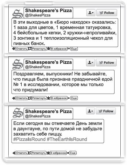 Мне приятно похвалить еще один малый бизнес, где работает талантливый писатель и чей контент неизменно хорош. Обратите внимание: третий твит кажется простой реакцией на День земли, но посмотрите, как ловко подобран хэштег. Он показывает, что компания понимает психологию пользователя Twitter; понимает, что маленькие детали, которые заставляют покупателей улыбнуться и сделать ретвит своим друзьям, кормят ваш бизнес. Чтобы произвести впечатление, Shakespeare's Pizza могла бы заплатить и за баннер, но никто бы не обратил на него внимания.
