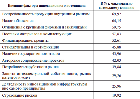 Видно, что внешние факторы, влияющие на инновационную деятельность предприятий, недостаточны, кооперации предприятий с научно-техническими организациями практически нет. Таким образом, налицо потребность в федеральной целевой программе развития инновационного потенциала.