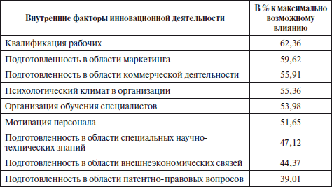 Из данной таблицы видно, что при улучшении возможностей для проведения инновационной деятельности возрастает и предприятие переходит на новую стадию. При этом наблюдается интересный факт, когда при переходе от стадии «выживания» к стадии «интенсивного развития» влияние внутренних факторов усиливается (от 50,49 до 64,81 % от максимального уровня), а влияние внешних факторов, наоборот, уменьшается (от 47,09 до 39,58 %).