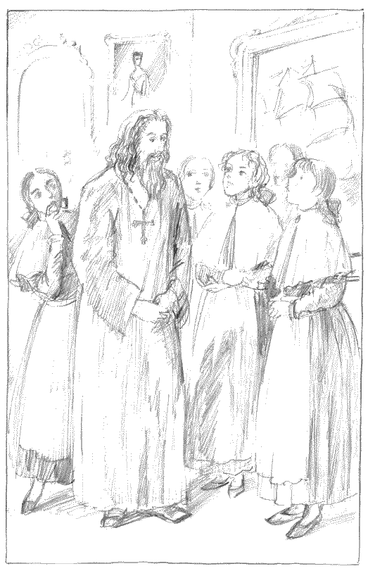 Первый урок был Священная история. Преподаватель, институтский духовник отец Адриан, молодой видный священник, носил щегольскую шелковую лиловую рясу.