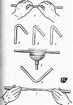 Надеть на горелку насадку («ласточкин хвост»), зажечь горелку и равномерно нагреть место сгиба (см. рисунок), спокойно вращая трубку вокруг оси. Когда трубка размягчается, вынуть ее из пламени и плавно согнуть. Правильность сгиба зависит от равномерности нагревания и плавности сгибания. При быстром сгибании трубка будет иметь на сгибе впадину сверху или выемку снизу, что недопустимо.