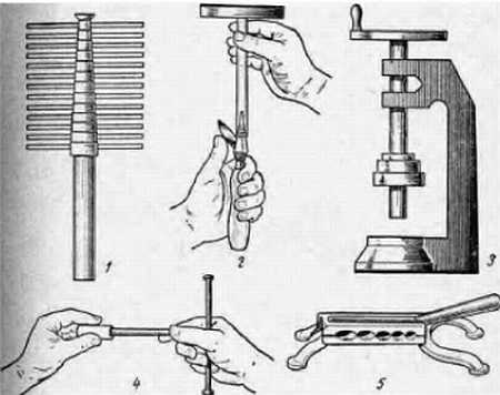 1 — набор сверл для пробок; 2 — точка сверла; 3 — машинка для сверления пробок; 4 — сверление пробки; 5 — пробкомялка (жом) для пробок