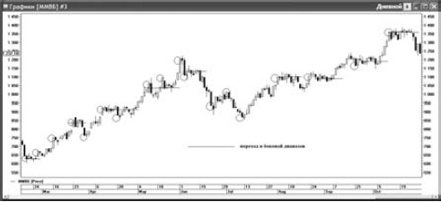 Для этой цели Ларри Вильямс предложил использовать значения дневных диапазонов – разницу между минимумом и максимумом дня. Эта величина показывает, насколько волатильным был рынок каждый день. Именно тогда, когда эта волатильность существенно увеличивается относительно недавних показателей, происходит изменение тренда. Таким образом, увеличение дневного диапазона на значительную величину является сигналом изменения в текущем направлении рынка.