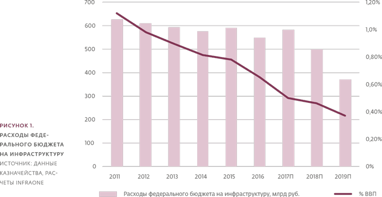 Расходы бюджетной системы на инфраструктуру в 2016 году продолжали сокращаться в реальном выражении и составили 2,5 % ВВП.