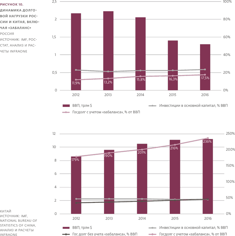 Доля долгов страны с учетом «параллельных» обязательств едва превышает 17,5 % ВВП («забаланс» в них всего 0,5 % ВВП), для сравнения в Китае этот показатель составляет почти 240 % ВВП (с долей забаланса в нем 64 %), и государство эту нагрузку выдерживает, хоть и балансирует на грани (см. рисунок 10 и подробнее см. «Чем полезен и опасен «забаланс»: победы и ошибки Китая»).